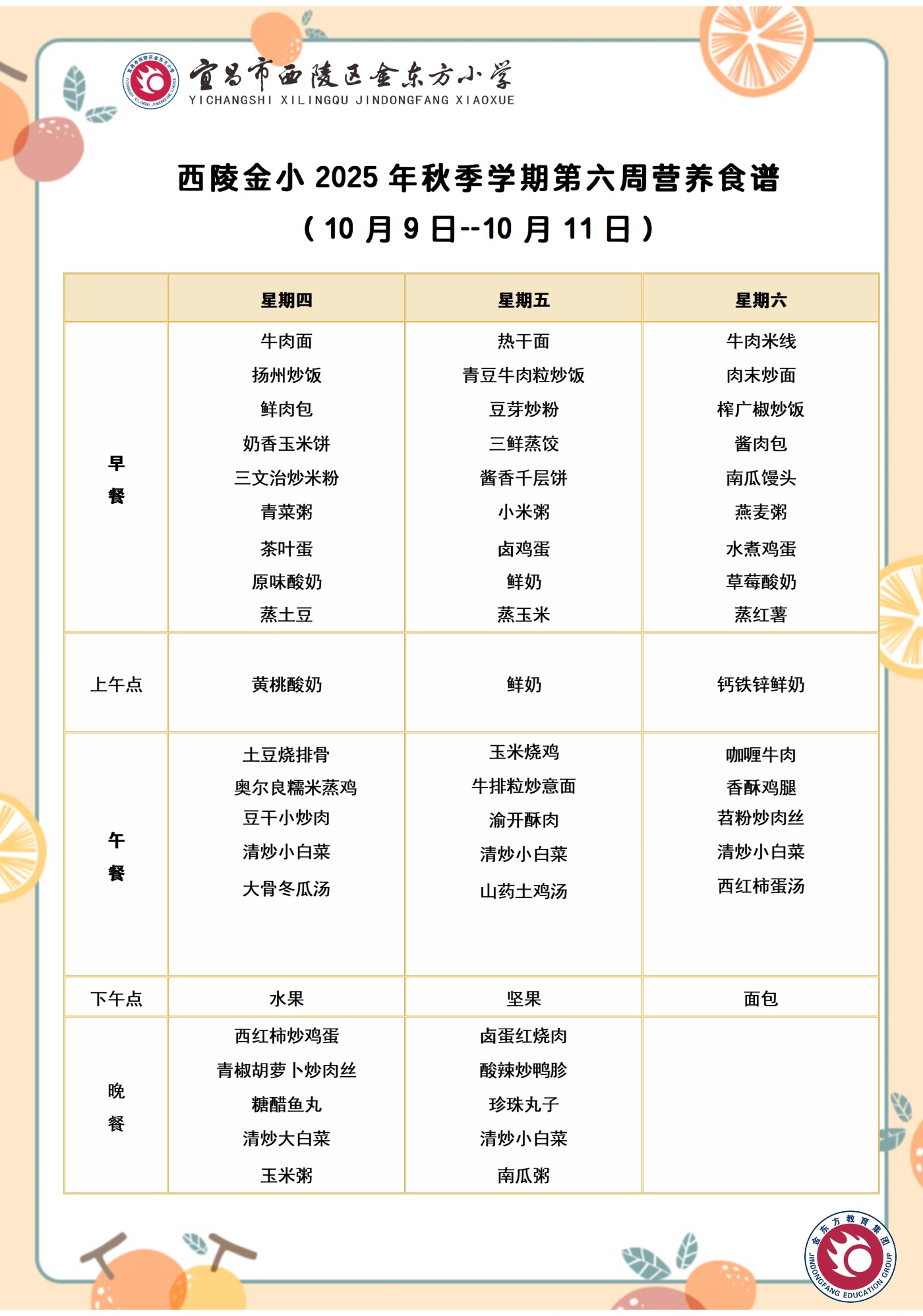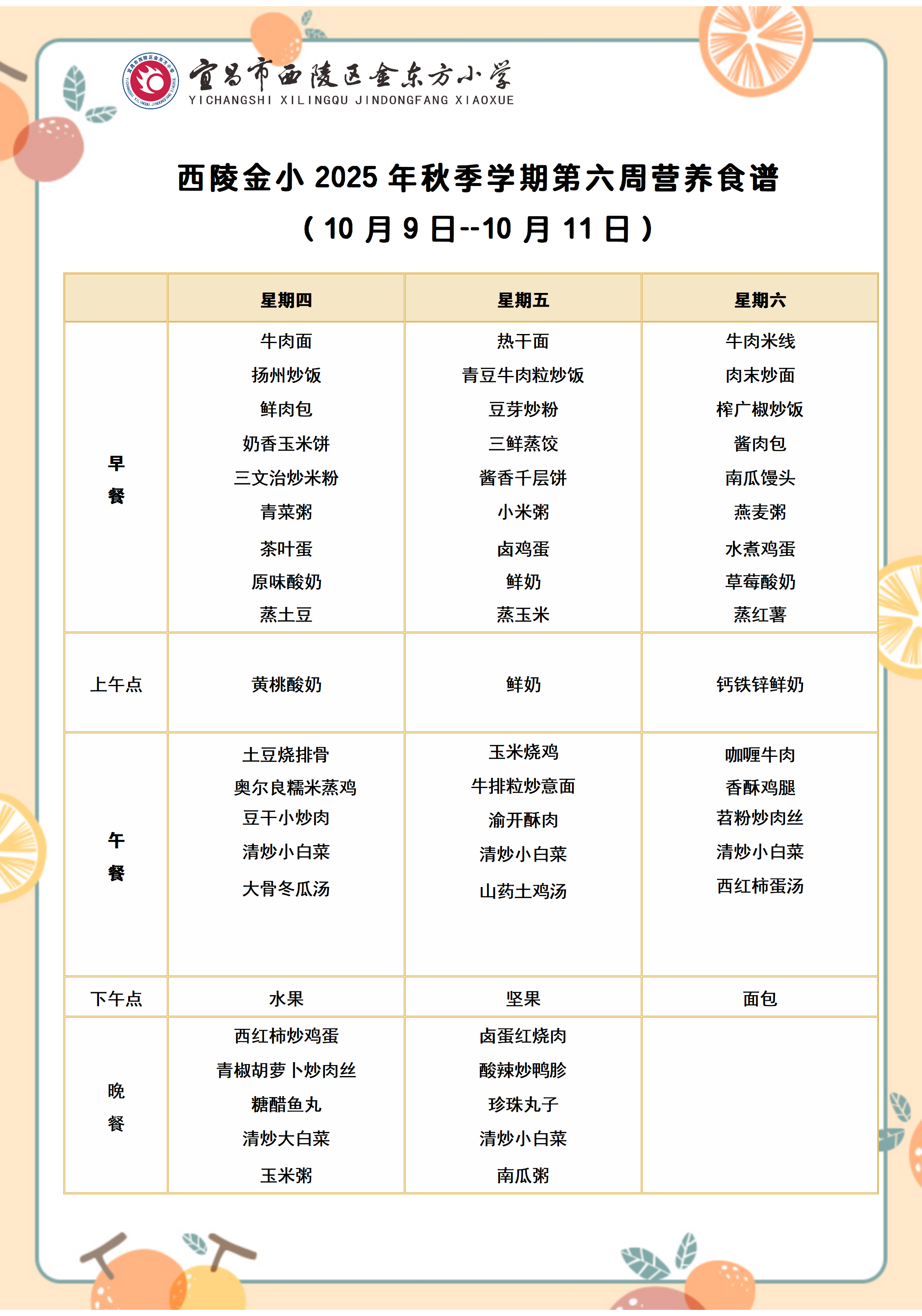 西陵金小2025年秋季学期第六周营养食谱