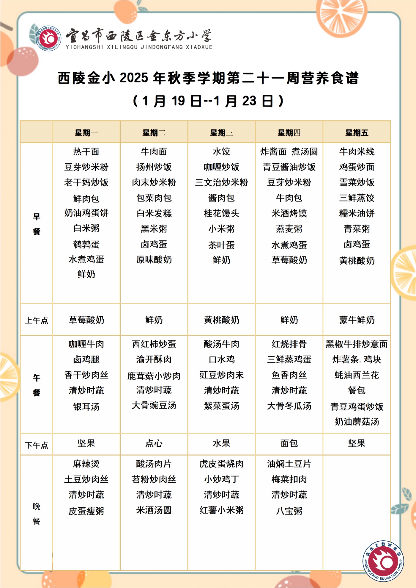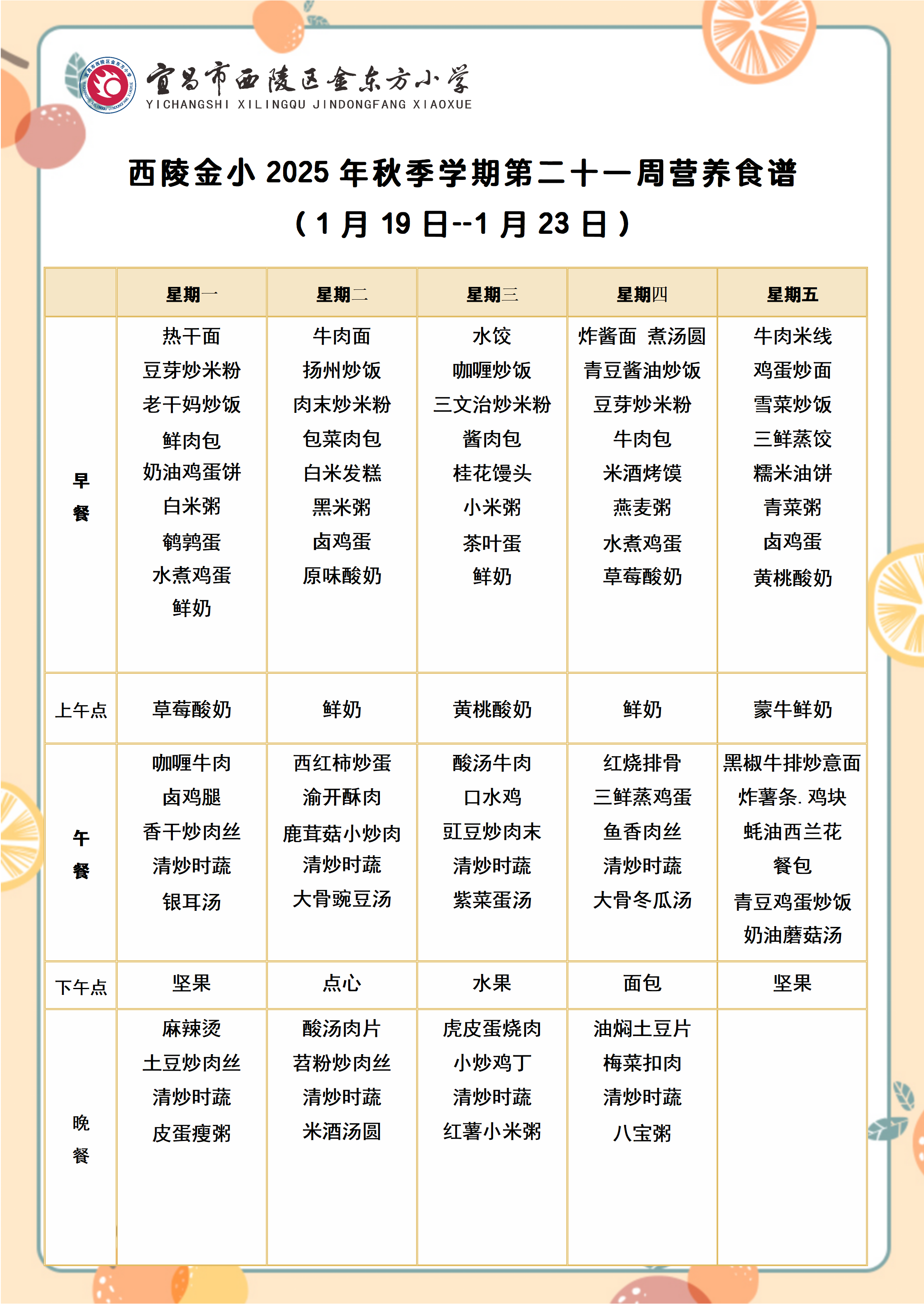 西陵金小2025年秋季学期第二十一周营养食谱