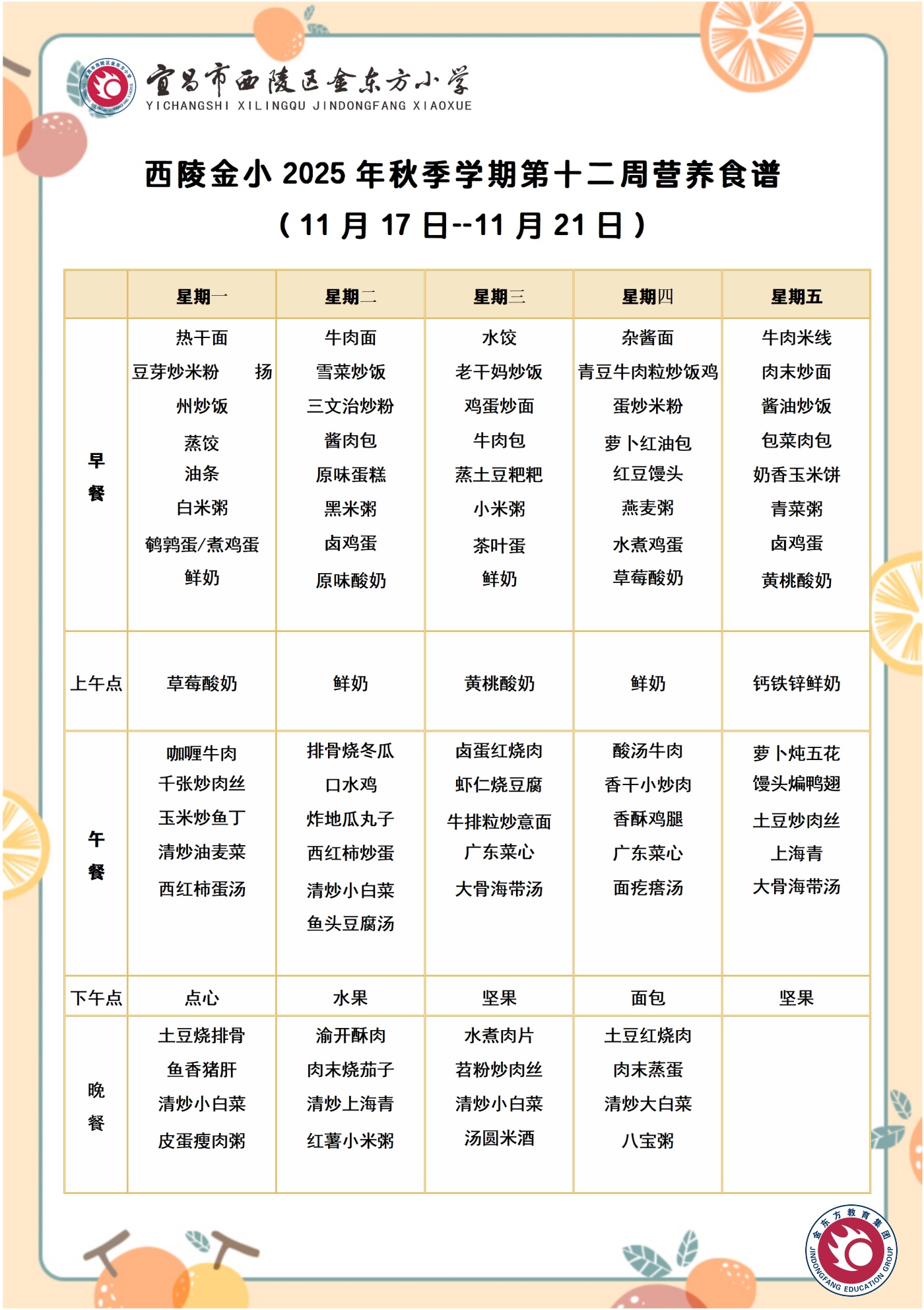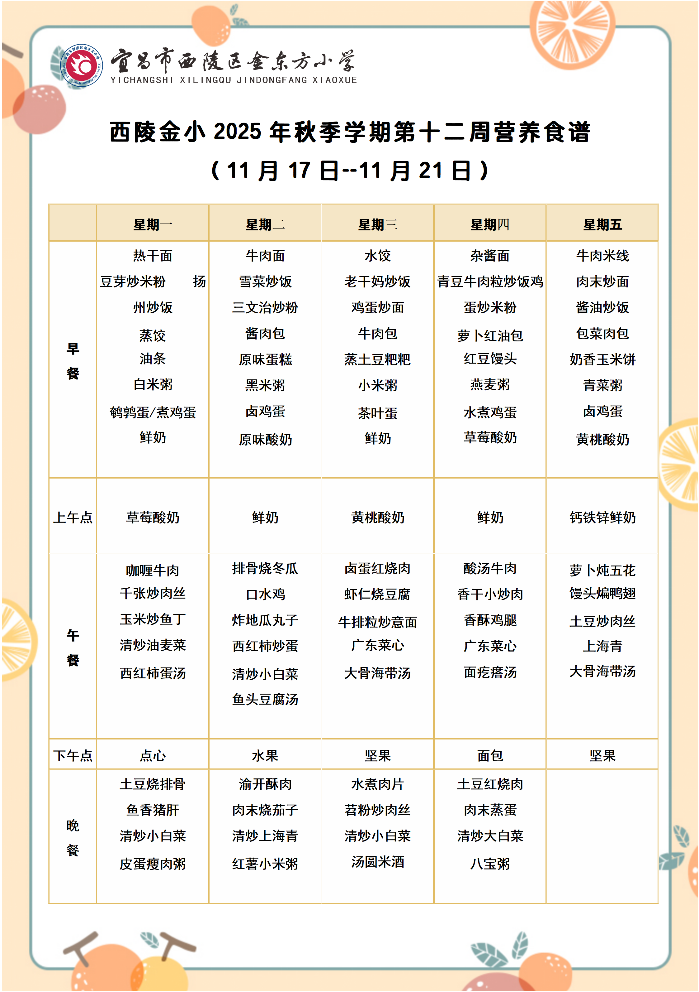 西陵金小2025年秋季学期第十二周营养食谱