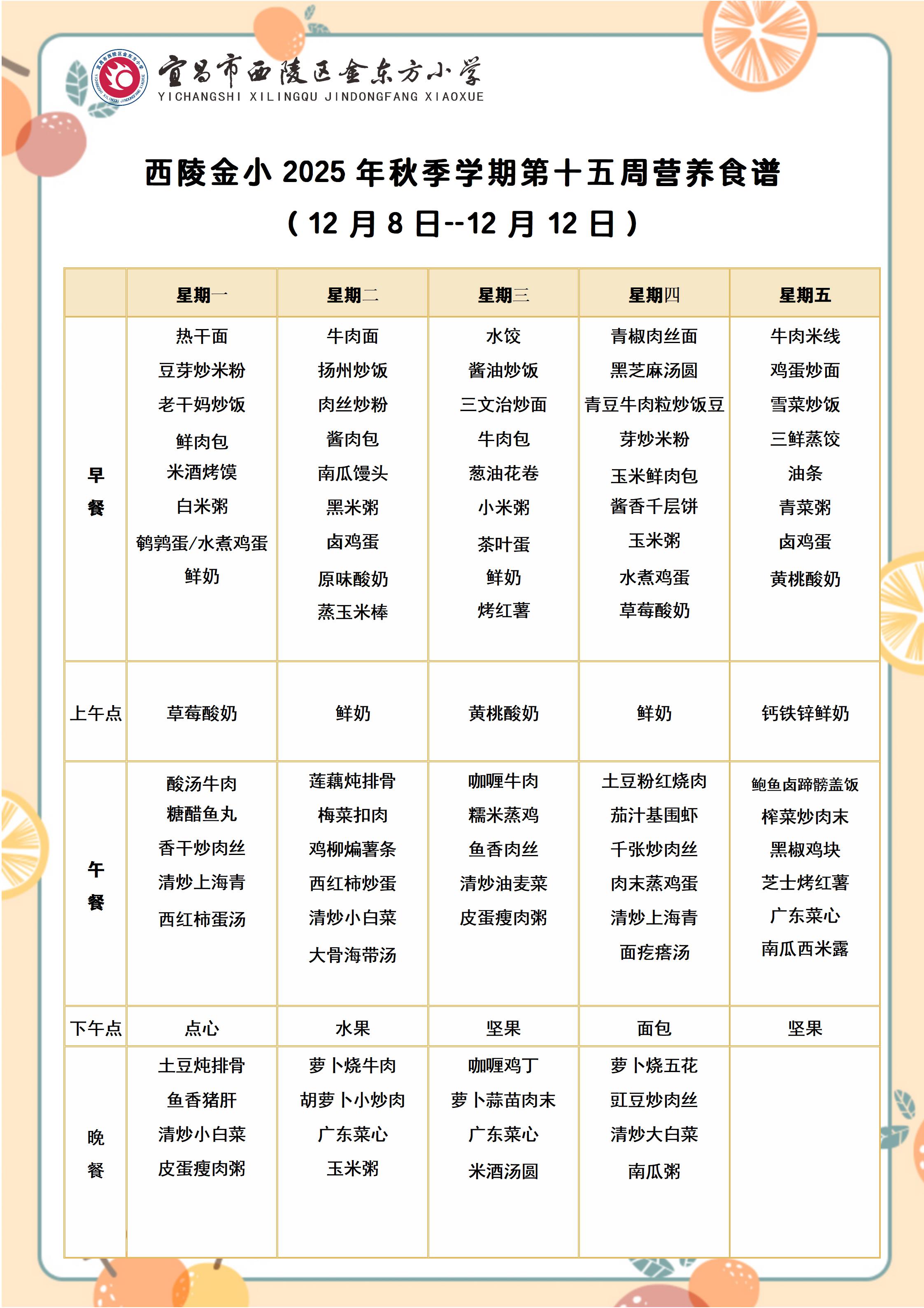 西陵金小2025年秋季学期第十五周营养食谱